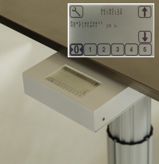 The working surface of both PHOTOvent models can be adjusted in height. They use synchronized, motorized pillar columns to evenly raise or lower the work surface height. Controls for this and the ventilation system can be accessed via the integrated touch panel display that slides out from under the work surface.