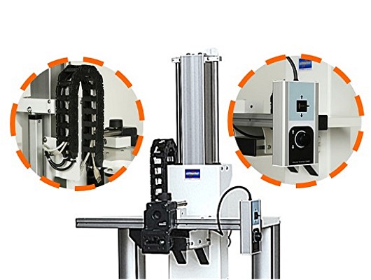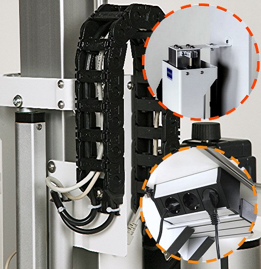 All cables for the workstation and cables you may need for your equipment can be run through our cable management chain system, which organizes cables to keep them out of the way and prevents cables from pulling or getting tangled when the height of the workstation or camera column is adjusted.
